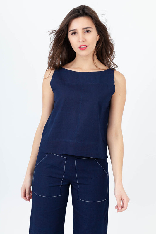 Petit top d'été facile à porter. Coupe simple et originale à la fois, avec son encolure bateau particulière qui rend le modèle très élégant et féminin. Des petites fentes présentes sur les côtés subliment le haut. Conçu et fabriqué en France, à Marseille, à partir de matières surcyclées.