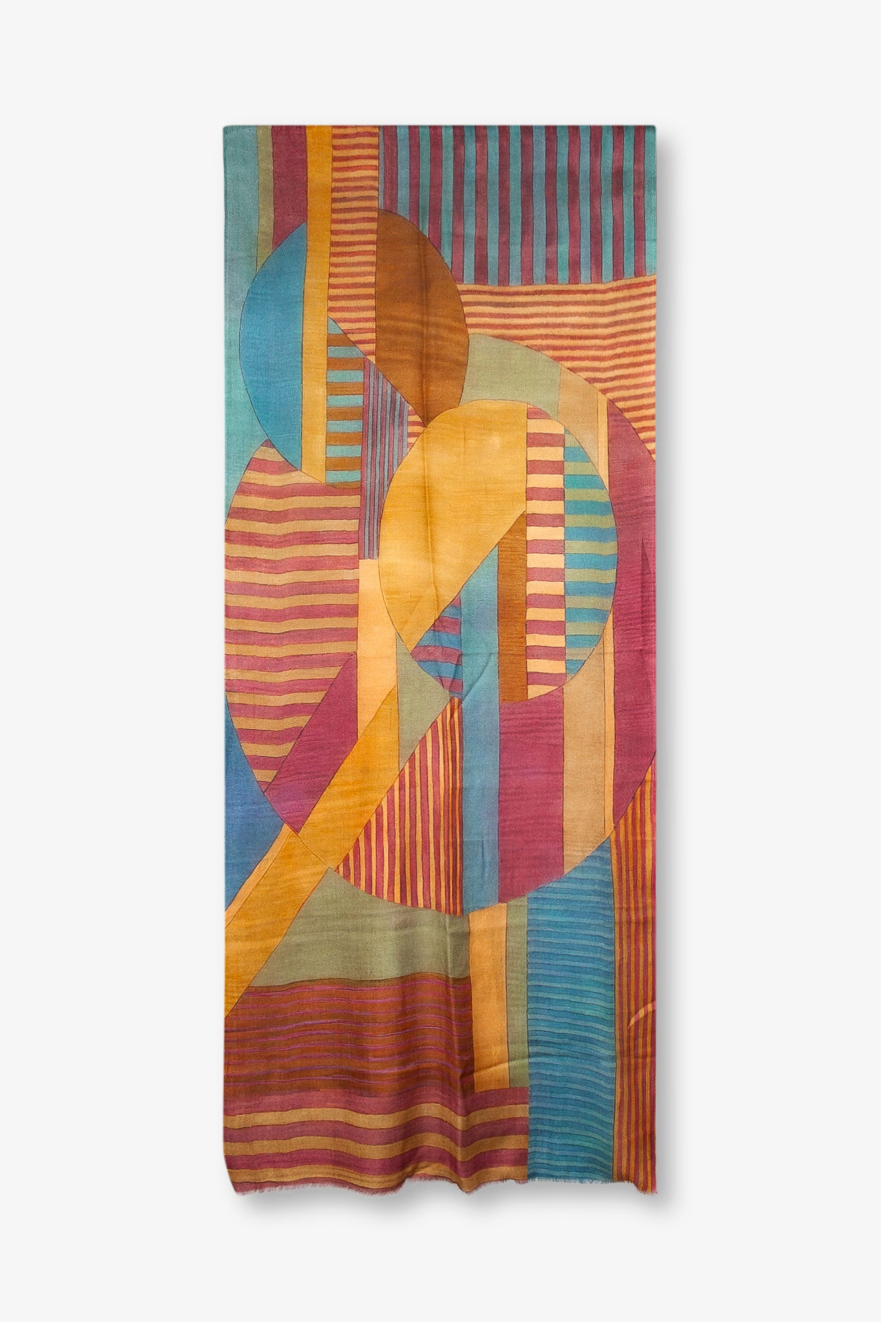 L'écharpe Bauhaus echo en laine et soie est un accessoire très stylé et intemporel. Fabriquée en Inde, elle offre une douceur et un confort incomparable. Son motif coloré et graphique va se marier à merveille avec votre look. Le motif présente une composition géométrique composée de carreaux et de motifs circulaires en éventail, organisés de manière asymétrique. Les couleurs sont douces, dans une palette de tons terre et pastel (verts, bleus, bruns, rouges orangés, et beige). L'effet est à la fois dynamique et structuré, donnant une impression d'équilibre entre rigidité et mouvement.
